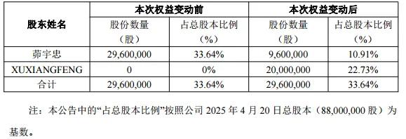 公告称,本次权益变动前,茆宇忠直接持有公司29,600,000股股份,占公司总股本的33.64%;同时持有威士顿(上海)资产管理有限公司98.67%的股权,威士顿(上海)资产管理有限公司持有公司21,000,000股,占公司总股本的23.86%,XUXIANGFENG未持有公司股份。上述股份皆为有限售条件的锁定股份。